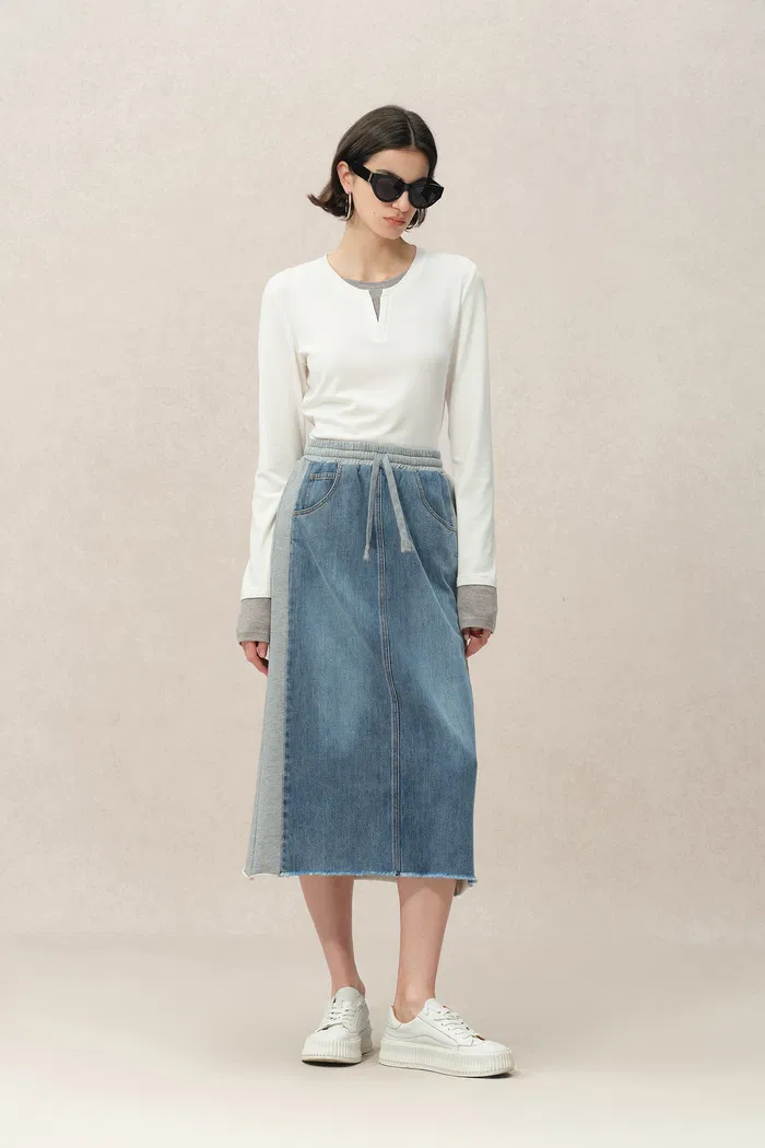 Elvin Patchwork Midi Skirt in Cotton Denim