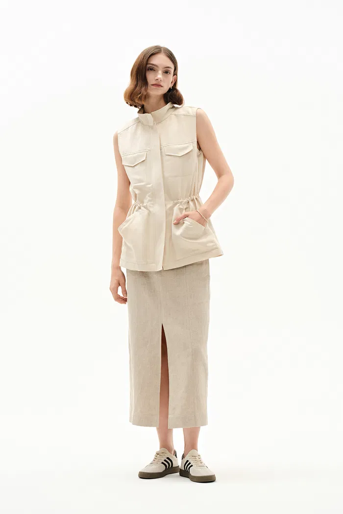 Your new favorite layering piece has arrived. This vest combines safari charm with silk-linen ease. Hidden drawstring shapes while tonal zips keep things sleek – utility details that know how to behave.