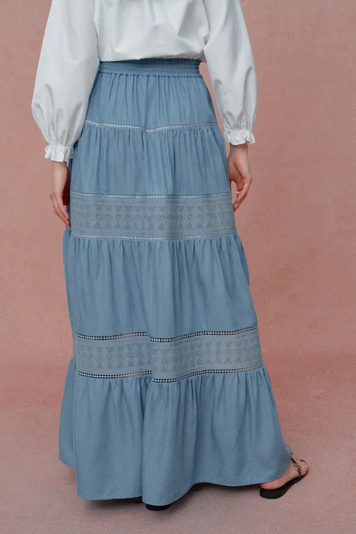 Oluka Tiered Openwork Maxi Skirt in Lightweight Denim