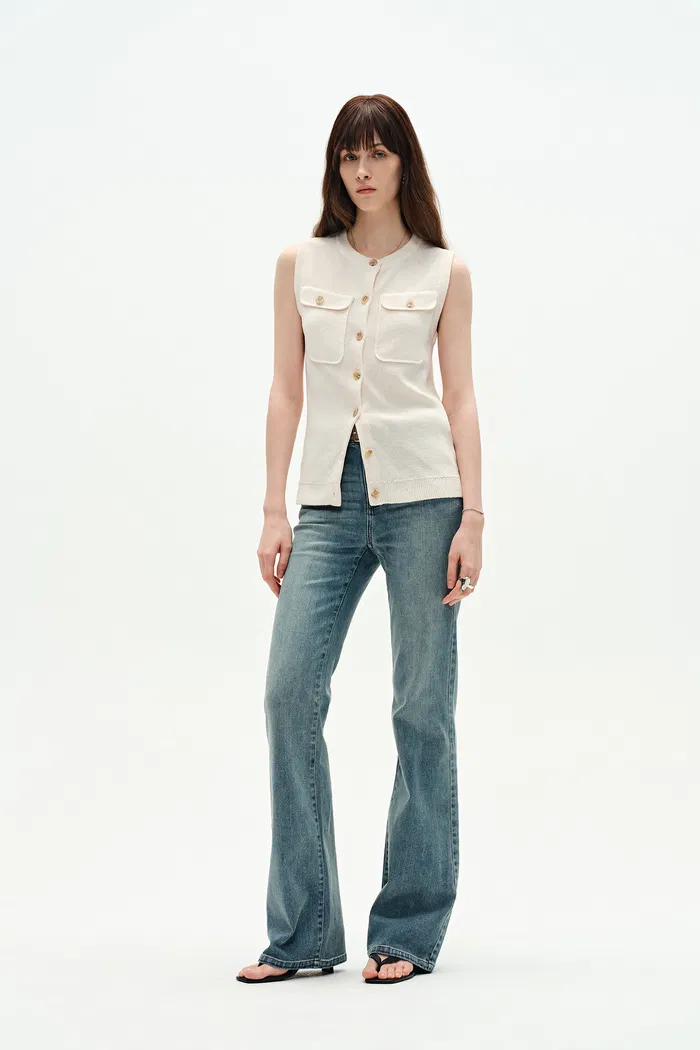 Think of this linen vest as your summer layering hero. Our signature X-seaming creates shape while tilted pockets flatter curves. Those horn buttons and ribbed trim? Pure vintage charm that stays fresh.